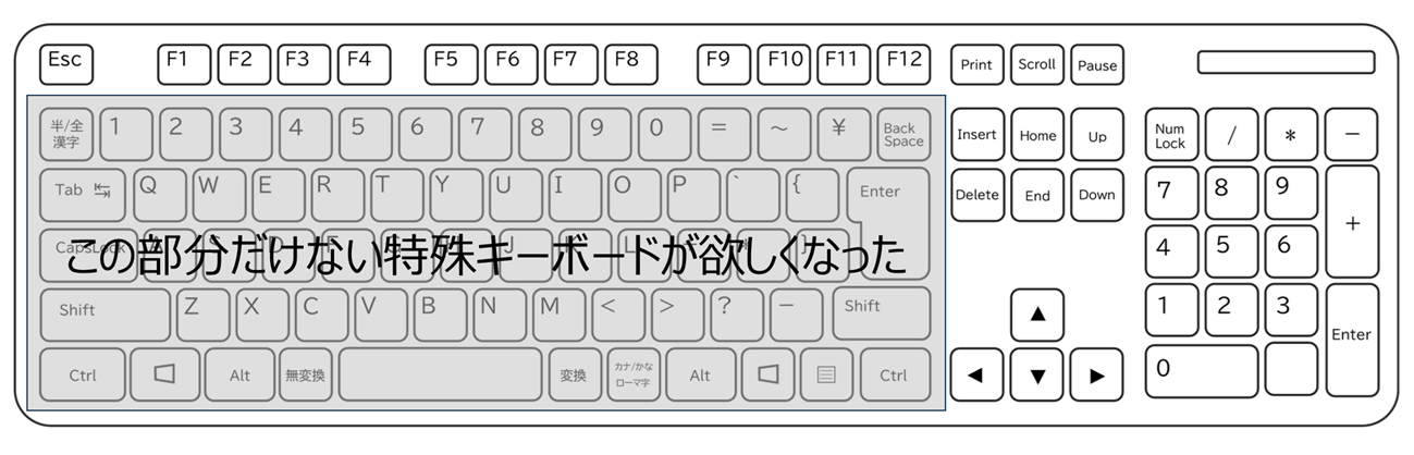 - この段階で既存キーボードのアルファベット部分を抜いたやつが欲しくなり探したがなかった。ファンクションキーのみ、テンキーのみはあったが、ファンクションキー+テンキーはなかった。